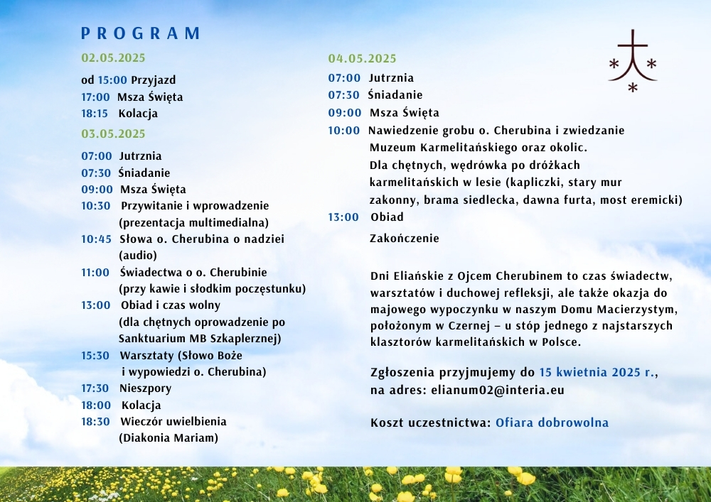 DNI ELIAŃSKIE Z O. CHERUBINEM ELIANUM ŚWIECKI INSTYTUT ŻYCIA KONSEKROWANEGO MENU HISTORIA WSPÓLNOTA ŚW. ELIASZ MULTIMEDIA KONTAKT ELIANUM – GALERIA ZDJĘĆ KOŚCIÓŁ JUBILEUSZOWY 2025 – SANKTUARIUM MB SZKAPLERZNEJ W CZERNEJ